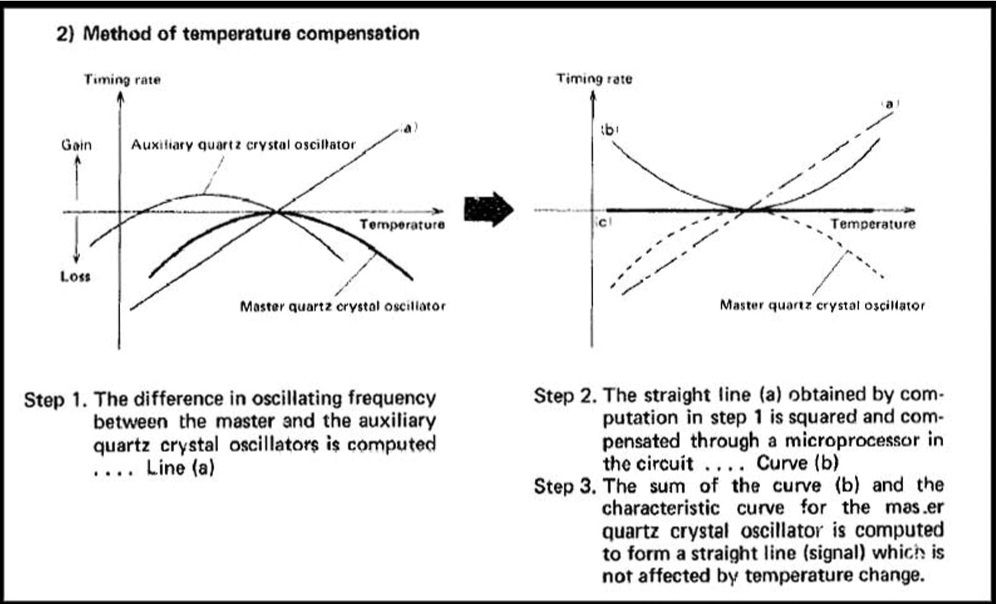 Bei diesem Verfahren arbeitet der „Master-Quarz“ mit der Standardfrequenz von 32.768Hz, während der zweite Quarz mit einer höheren Frequenz schwingt. Beide Quarze verändern ihre Frequenz in Abhängigkeit zur Temperatur, jedoch auf unterschiedliche Weise. Für jede gegebene Temperatur ergibt sich so eine spezifische Differenz zwischen den Frequenzen der beiden Quarzkristalle. Diese Frequenzdifferenz wird erfasst und gemessen, dient damit als indirektes Maß für die Temperatur und wird als Eingangssignal für eine Kompensationsschaltung verwendet. Im Technischen Handbuch für das Kaliber 9923A wird diese Methode näher erläutert:
