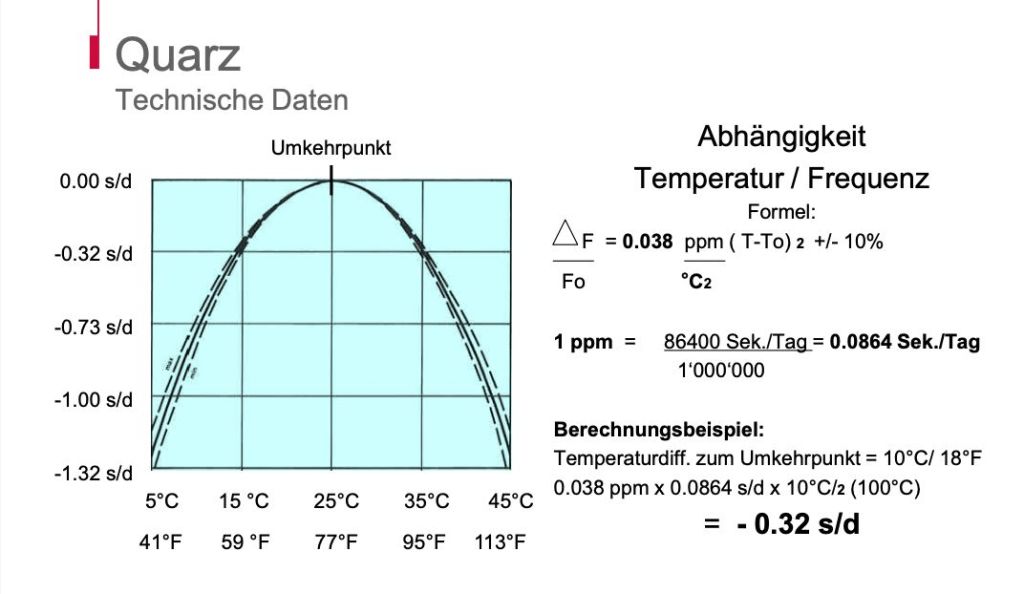 Sehr vereinfacht: Die Uhr läuft bei Raumtemperatur, also 25°C, mit einer Gangabweichung von +/- 0s. Temperaturabweichungen nach oben oder unten verändern die Frequenz des Quarzes und führen so zu einem Nachgang der Uhr – und der ist nicht unerheblich. Bereits eine Temperaturdifferenz von 10°C zum Umkehrpunkt führen zu einer Gangabweichung von etwa -0,3s am Tag. Bei einer Temperatur von -5°C oder +35°C beträgt sie bereits -1,3s am Tag.