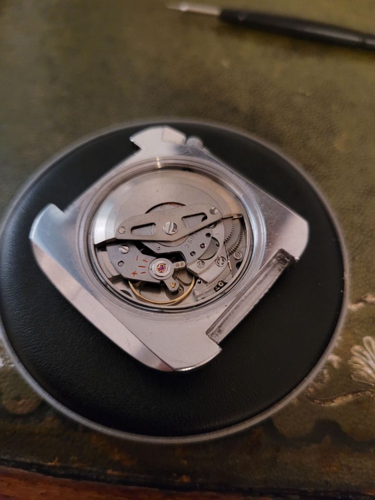 Die Revisionsgeschichte der vorgestellten Seiko Orange Block ist mir nicht bekannt. Vermutlich hat das Werk seit der Produktion der Uhr im Jahr 1971 nie einen Uhrmacher gesehen. Nach 55 Jahren läuft es immer noch mit einer Gangabweichung von rund 30s am Tag und bei Vollaufzug fast 45 Stunden durch. Das zeigt, wie robust dieses Kaliber tatsächlich konstruiert ist. Ohne Handaufzugsmöglichkeit und ohne Sekundenstopp war es von Anfang an auf Langlebigkeit und einen sehr geringen Wartungsbedarf ausgelegt. Ersatzteile, insbesondere in Form von „Schlachtwerken“, sind aufgrund der hohen Produktionszahlen noch immer problemlos und günstig zu finden. Der berühmte „Seiko Shuffle“ – also das idealerweise in Form einer 8 ausgeführte „Schütteln“ der Uhr zum Werkaufzug, in Ermangelung des Handaufzugs – fällt bei diesem Kaliber überraschend kurz aus. In der Regel reicht bereits eine kurze Bewegung aus, um die Uhr in Gang zu setzen. Das Fehlen des Sekundenstopps ist bei einem Uhrwerk wie dem 6119, das ja ohnehin keinen Anspruch auf Chronometergenaue Präzision erhebt, zu verschmerzen.