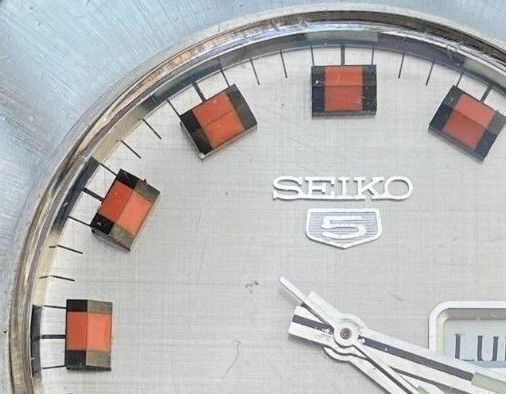 Sowohl der Seiko-Schriftzug als auch das für die ersten Seiko 5 Sports typische Schild mit der „5“ sind aufgelegt. Der Druck der Minutenindizes und des „Automatic – 21 Jewels“-Schriftzugs ist gleichmäßig und sauber. Ebenso das kleine Suwa-Logi und der Dialcode „Japan 6119-7400 T“.
